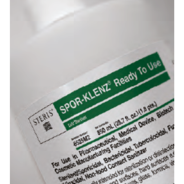Esterilizante en frío listo para usar Spor-Klenz ® de STERIS es un esterilizante/desinfectante en frío líquido de acción rápida, filtrado a 0,22 micras y formulado específicamente para su uso en la esterilización y desinfección de superficies ambientales duras en instalaciones de fabricación farmacéutica, de dispositivos médicos, biotecnológica y cosmética. Este producto es una mezcla estabilizada de ácido peracético, peróxido de hidrógeno y acético que proporciona un control microbiano rápido y eficaz, incluidas las esporas. Todos los ingredientes activos están notificados de acuerdo con la Directiva de productos biocidas (BPD) de la Unión Europea. El esterilizante listo para usar Spor-Klenz ofrece un perfil de baja toxicidad, no requiere mezcla ni activación y es reutilizable hasta por 14 días, lo que reduce el desperdicio. Cada lote es completamente rastreable y está documentado por un Certificado de análisis que incluye filtración y esterilidad USP.